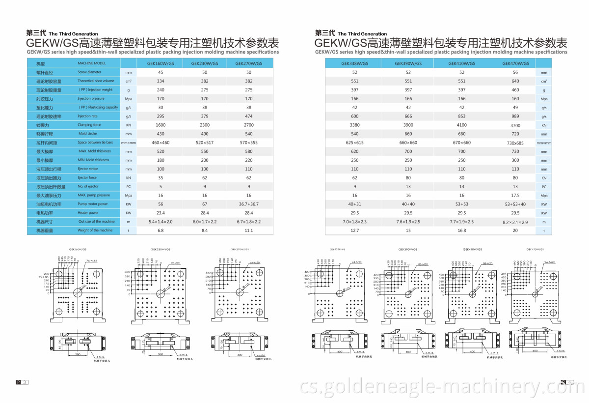 Vysokorychlostní tenkostěnný plastový balicí stroj GEKW/GS je vybaven vysoce tuhým zámkovým systémem, díky kterému je deformace šablony extrémně malá, což je velmi vhodné pro výrobu tenkostěnných výrobků a dokonce i náročných rozměrů.