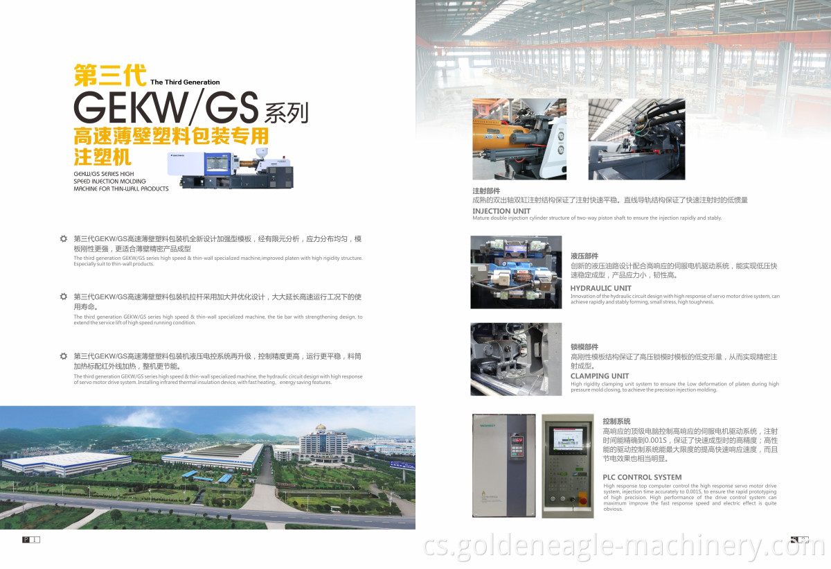 Vysokorychlostní tenkostěnný plastový balicí stroj GEKW/GS s vysokým výkonem systému pohonu servomotoru a optimalizací hydraulického systému výrazně zlepšuje rychlost vstřikování a přesnost vstřikování, ale také výrazně zkracuje cyklus formování, zlepšuje efektivitu výroby atd.